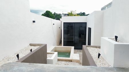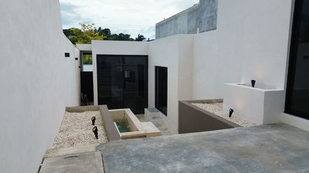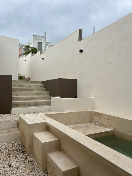 Terraza con alberca de acabados de chukum, equipada con bomba para desagüe.