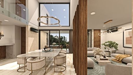Planta baja: recibidor, sala, comedor a doble altura, cocina integral con alacena, baño de visitas, recámara con baño privado, cuarto de servicio, área de lavado, patio de tendido, terraza techada con asador, alberca, doble pasillo de servicio.