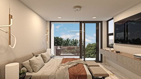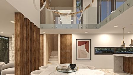 Planta alta: recámara 2 con clóset vestidor y balcón, recámara principal con clóset vestidor, jacuzzi y balcón, sala de TV con balcón.