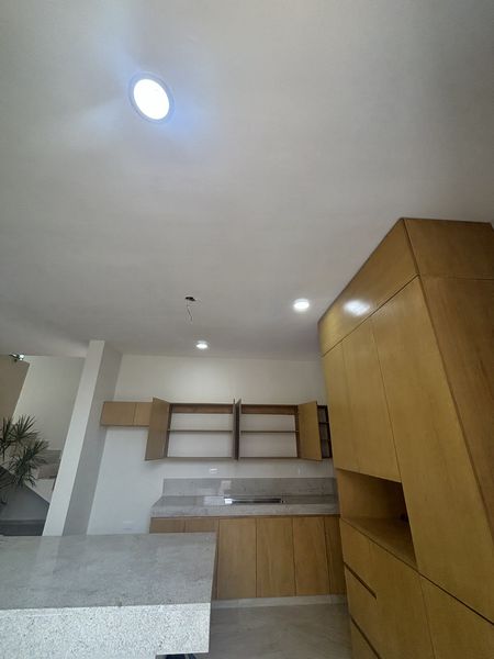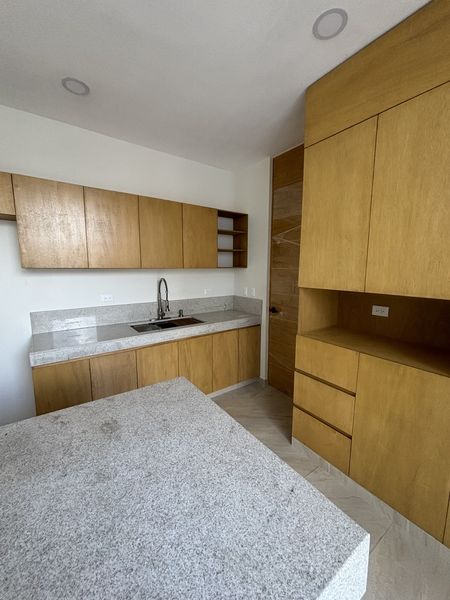 EQUIPAMIENTO: carpintería en cocina con gavetas y alacena de madera de encino modelo Rosa Mora , en baños con puertas inferiores del lavabo y en la recámara principal el clóset vestidor.