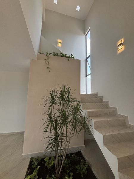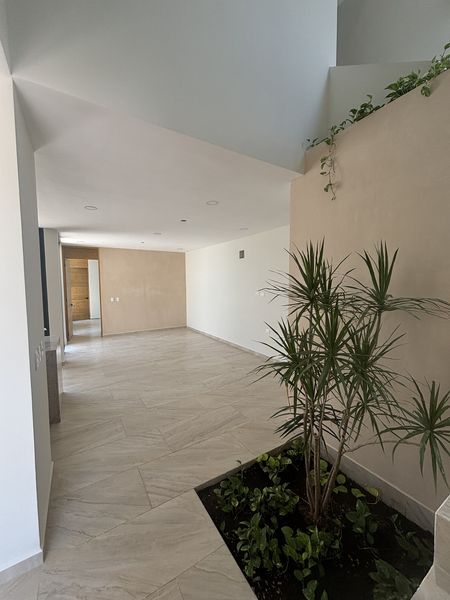 Espacio para 2 autos , doble altura en el cubo de escalera, jardín interior, sala y comedor en planta libre con conexión a la terraza y alberca, cuarto de lavado conectado al pasillo de servicio ,recámara en planta baja con jardín privado y las 2