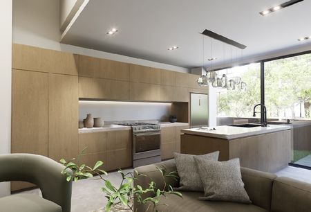 Planta baja 90m2: recámara con baño completo, cocina abierta, sala comedor, con doble altura y jardín de 34m2