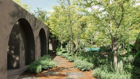 Un lugar diseñado para la frescura y la diversión, donde se fusiona un jardín holístico de árboles frutales con una piscina lista para nadar por horas.