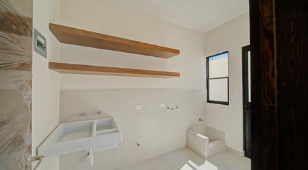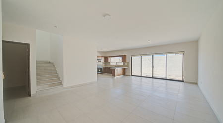 Cuenta con cochera techada para 2 autos, recibidor, medio baño de uso común, sala, comedor con salida a patio trasero, cocina, alacena, lavandería techada con salida al pasillo de servicio.