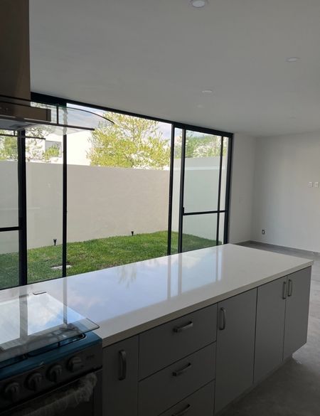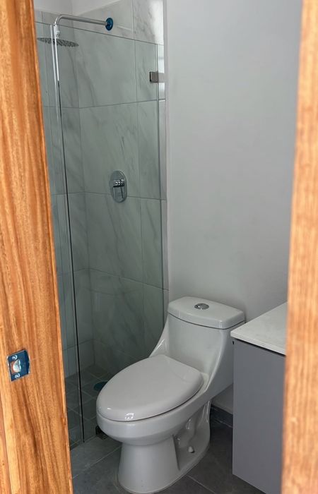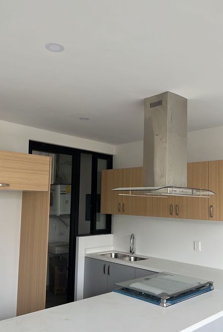Un baño completo en planta baja y un pequeño estudio. La área para sala, espacio para comedor, cocina integral con estufa, campana, horno, área de lavado.