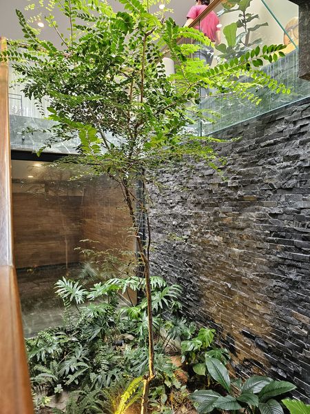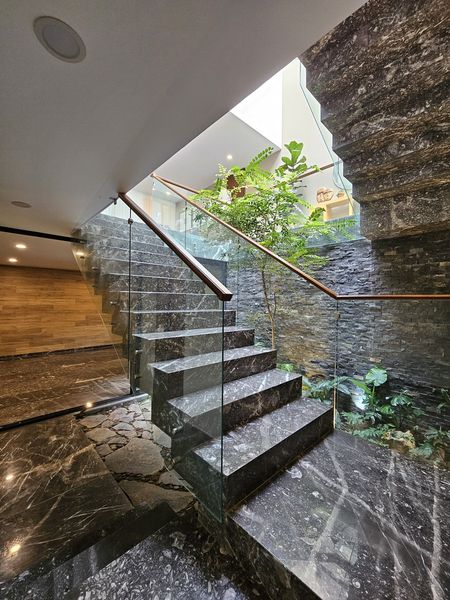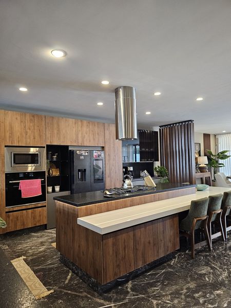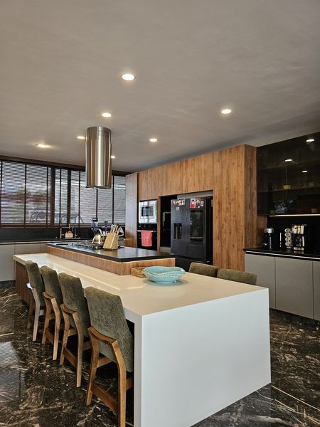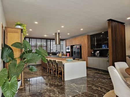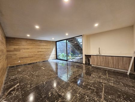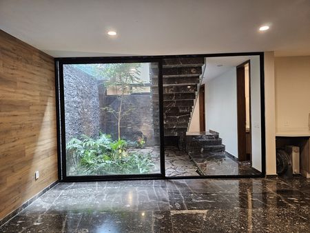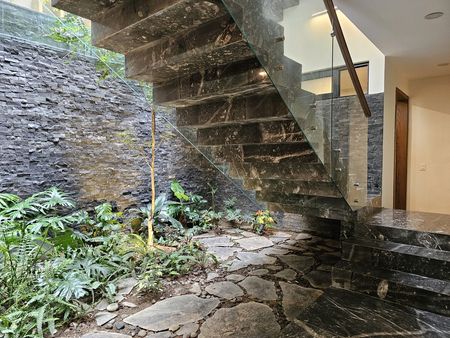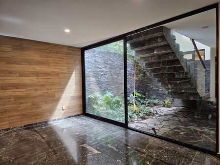 Casa con terminados de lujo, cocina muy amplia, ventanales de piso a techo, jardín que viene del sotano y remata en una triple altura.
