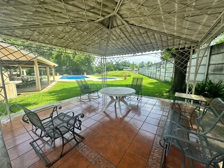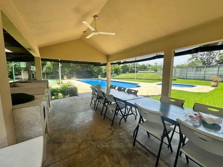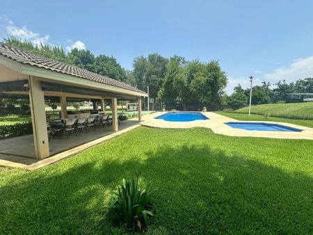 La propiedad esta conformada por dos terrenos campestres, uno de los cuales es usado como casa del trabajador y el otro se encuentra una quinta campestre, con casa principal, sala, comedor, cocina, baños y recamaras, mas otras dos secciones con recamara y baño, se encuentra un area ajardinada, alberca, palapa con asador, cuarto de juegos con baño, cuarto de maquinas y celdas solares.