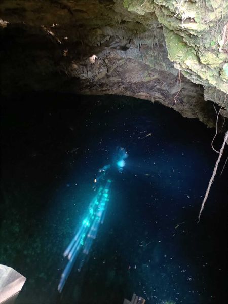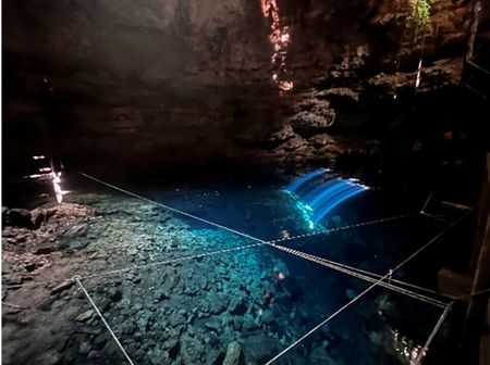 carretera y un cenote habilitado para ser utilizado como atracción turística
