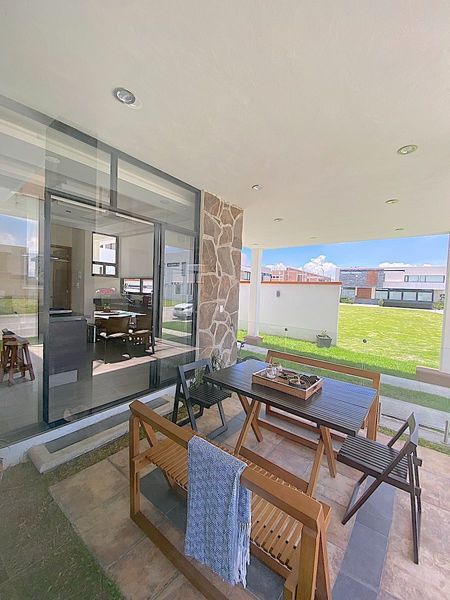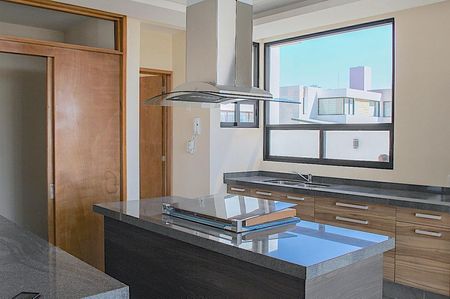 sala, comedor, estudio con ventanales de piso a techo, medio baño para visitas, moderna cocina abierta con barra e isla con estufa y cubiertas de granito, desayunador rodeado de ventanales de piso a techo, area de lavado y cuarto de servicio y amplias escaleras con barandal de cristal templado, para acceder al 1er nivel donde se encuentran, 2 recámaras secundarias cada una con baño y closet, la recamara con closet-vestidor, baño con tina, y el family. El family y la recamara principal tienen acceso a 1 amplia y acogedora terraza con pérgola.