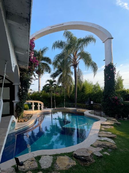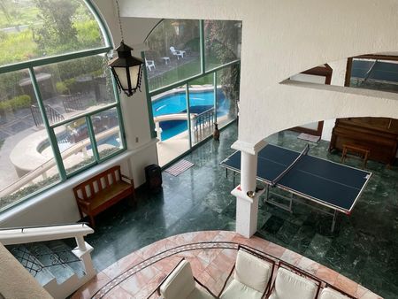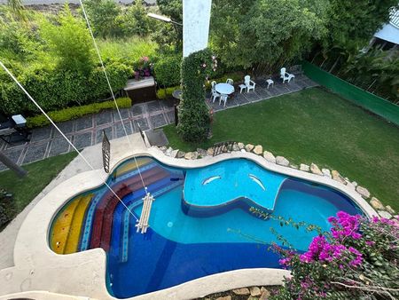 Alberca de 60 mil litros, Caldera de gas, profundidad máx 1.80 mts y mín 50 cms, bajo un puente que comunica hall y recámara principal, así como baño-vestidor de alberca. Preciosa y espectacular Cascada de 7 mts de altura, Chapoteadero, Escalones, Rampa barandal y Columpio bajo la cascada.