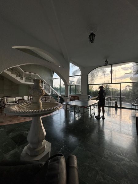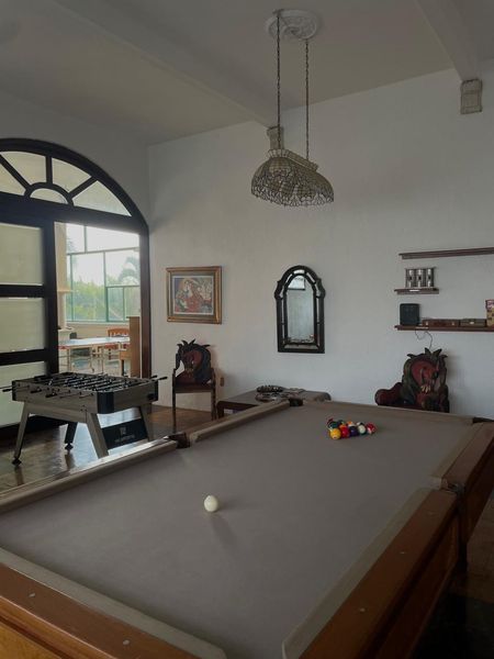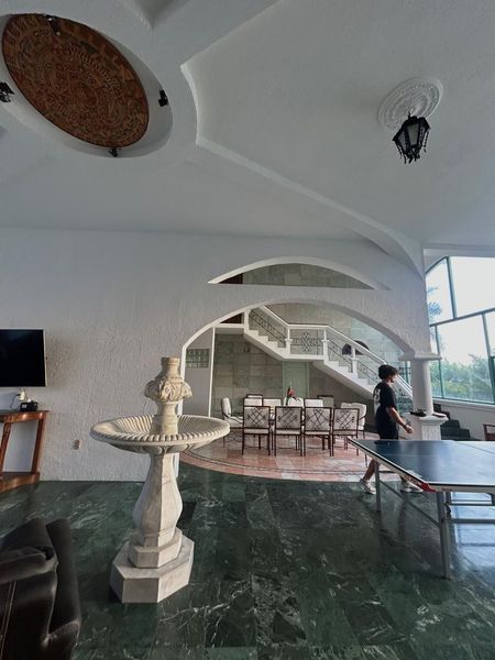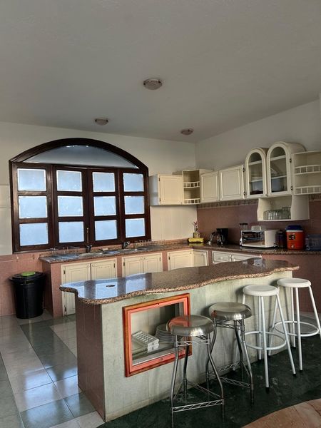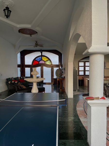 PB con reja central, rampa, puertas y ventanas de madera, gran vestíbulo, fuente de mármol y enorme ventanal al poniente, pisos de mármol y parquet. Amplia cocina integral, cubiertas de Granito, Estufa Industrial, Isla, doble tarja, despensas, comedor 16 personas. Área de lavado techada. Amplia Sala TV. Junto al hall gran cuarto de juegos con Mesa de Billar profesional, Dominó y Póker de fina madera y Futbolito. Opcional Mesa de Ping Pong.