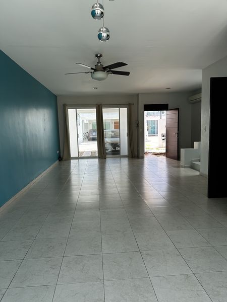 Casa con amplia sala y comedor, con aire acondicionado, cortinas y ventilador.