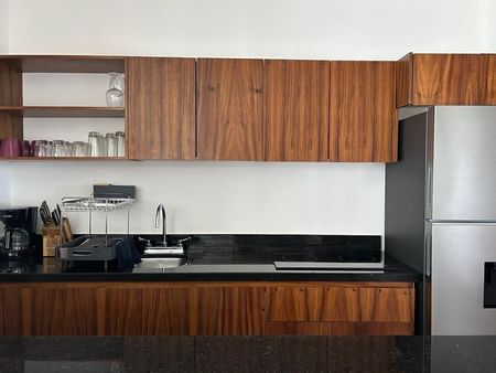 COCINA EQUIPADA CON GABETAS Y BARRA DESAYUNADORA , ESTUFA DE INDUCCION , REFRIGERADOR , CAFETERA Y UTENCILIOS DE COCINA