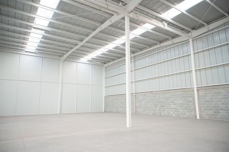 Muros: fachada de panel aislado de 1 1/2″ en color. Lados de block hueco de 15cm de espesor (acabado aparente 2.5m de altura), altura adicional hasta techo de lámina pintro