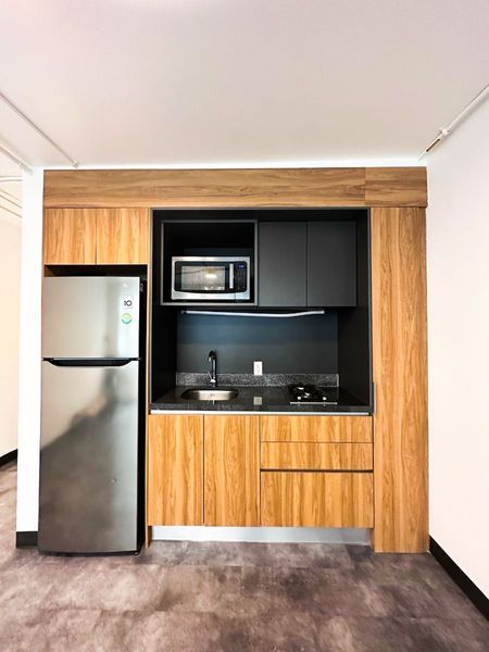 Sin amueblar. Cuenta con 1 cama oculta para optimización del espacio, ante-comedor, cocina totalmente equipada y baño independiente.