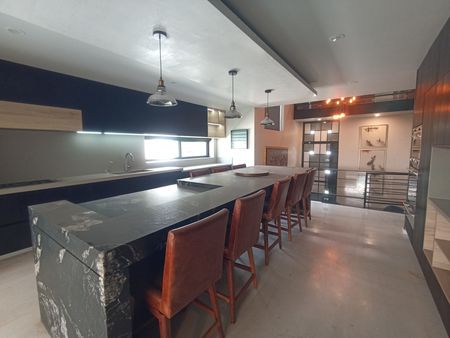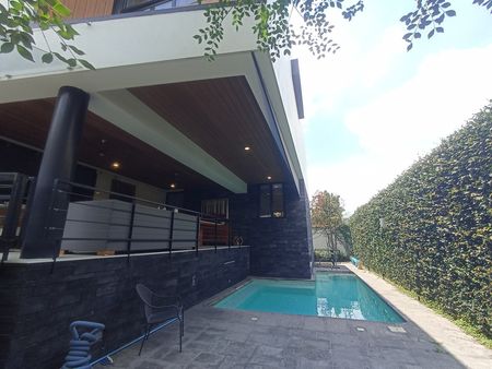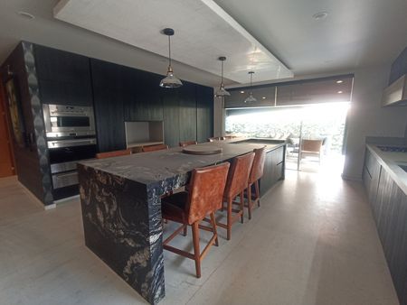 - Planta Baja: Sala a doble altura, medio baño, barra de bar con cava de vinos, cocina equipada con electrodomésticos de alta gama, terraza techada, alberca con cascada y calefacción, solarium, y acceso de servicio lateral.
