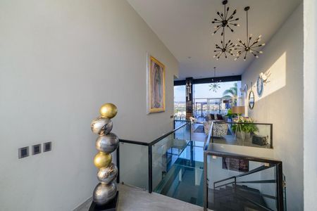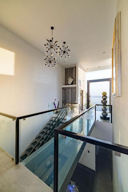 Pasillo de cristal templado en el piso que comunica a la sala y comedor con grande terraza y hermosa vista a la zona.
