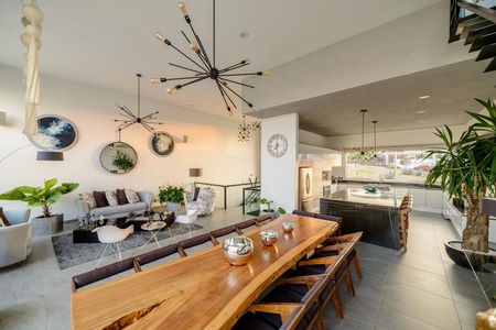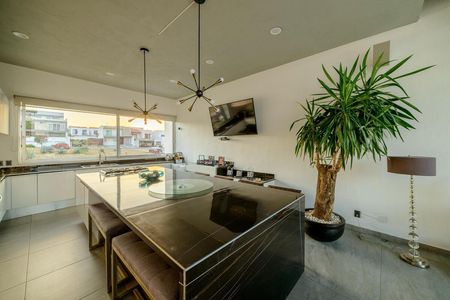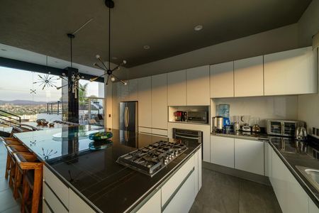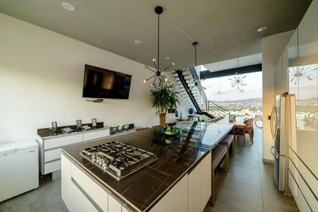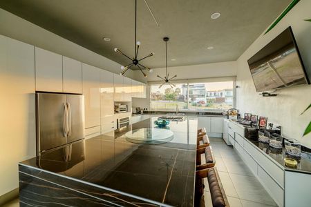 Lujosa cocina súper equipada con isla desayunadora al centro, completamente abierta y en comunicación con el comedor.