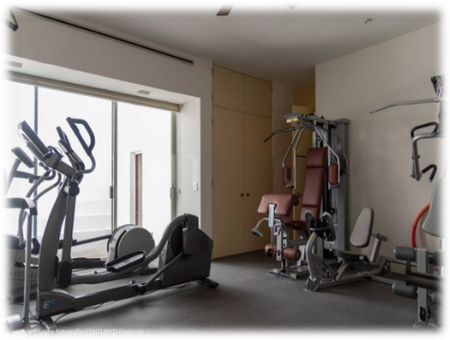 Gimnasio con walk-in closet y baño completo, con acceso a terraza y jardín privado.