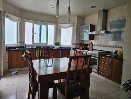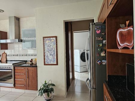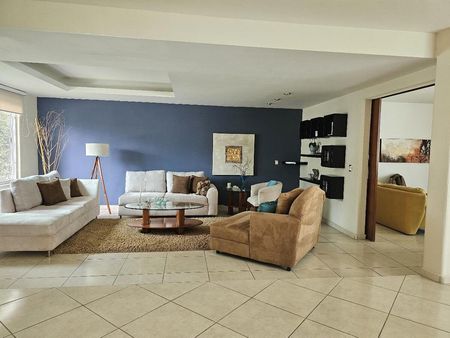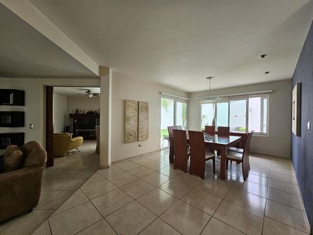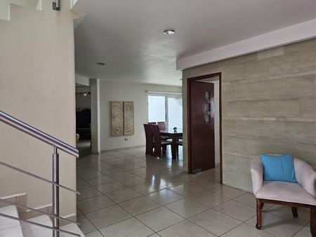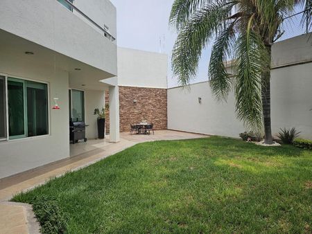 Garage techado, entrada de doble altura y recibidor, estancia en desnivel, estudio, cuarto de T.V. o recámara, amplio jardín con dos terrazas y medio baño, cocina equipada, área de lavado, cuarto de servicio con baño completo, área de tendido y bodega.