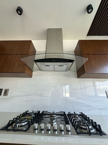Cocina integral de madera y cuarzo, tarja doble de acero inoxidable marca interceramic. Medio baño de visitas.