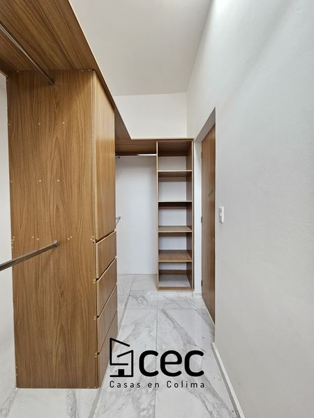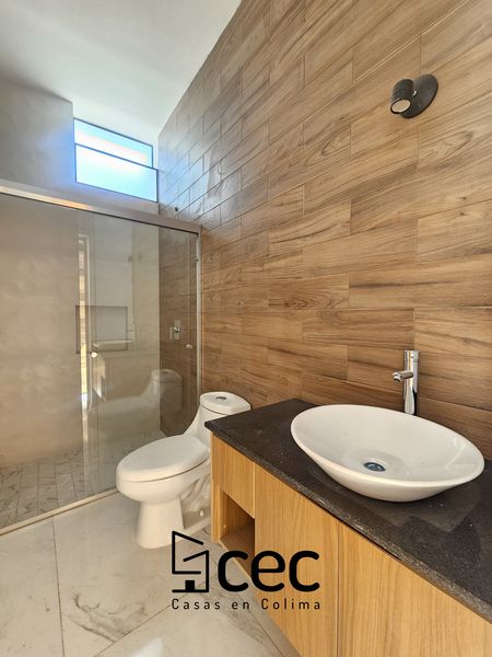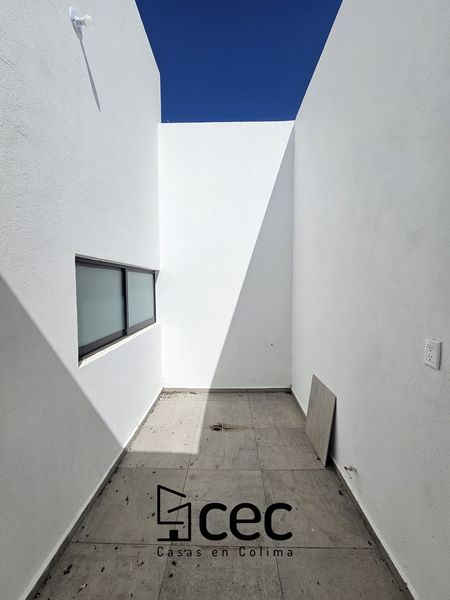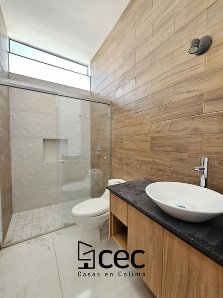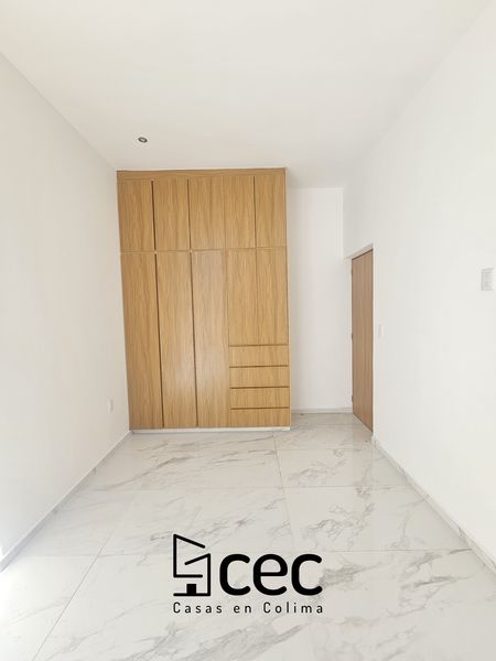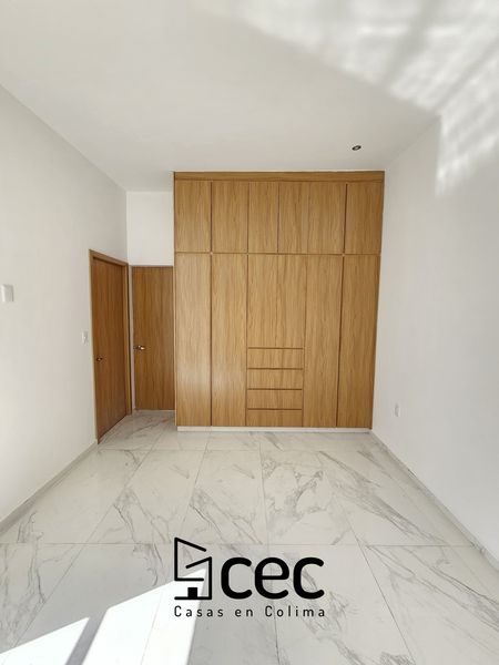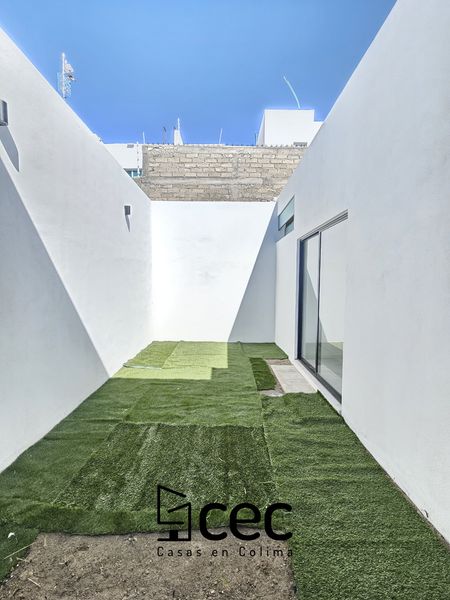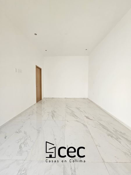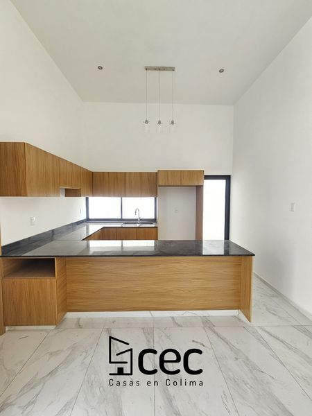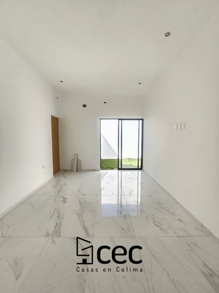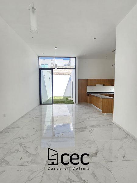 Residencia al norte de Villa de Álvarez, 1 planta, cochera para 2 autos, 3 recámaras, recámara principal con baño y vestidor, 2 baños completos, sala, comedor, cocina, techo doble altura, jardín.