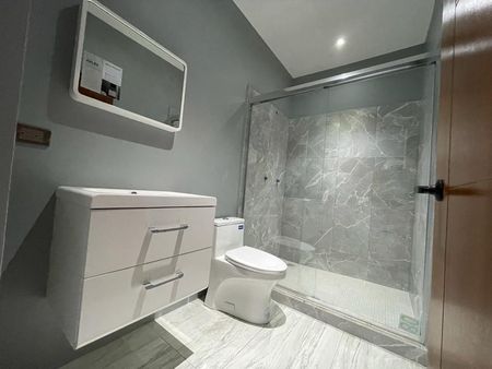 Baño completo con cristal templado y lavabo con espejo de sensor.