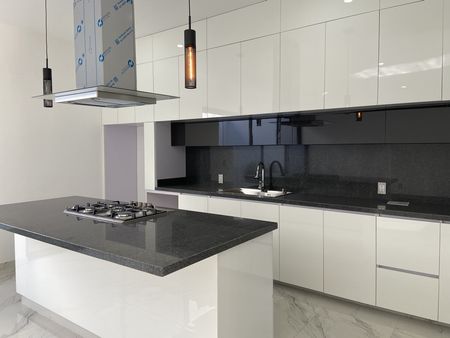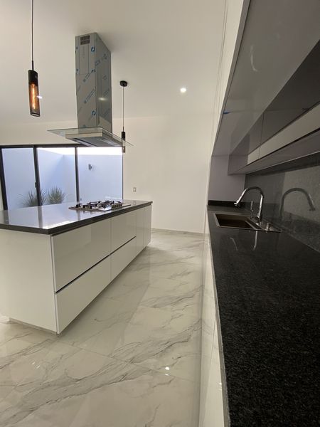 Cocina integral al alto brillo, equipada con hornos y barra de granito
