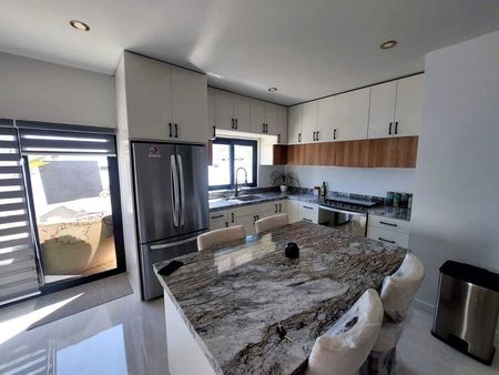- Cocina integral con cubierta de granito equipada con estufa, campana y refrigerador