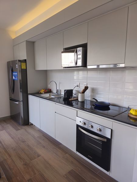 Cocina integral equipada con refrigerador, parrilla, horno de microondas.