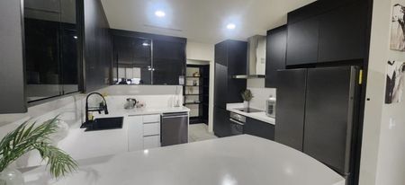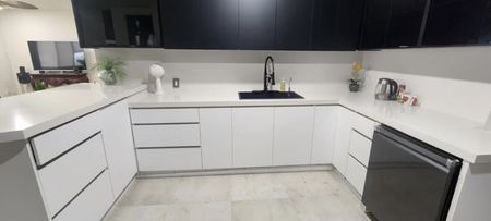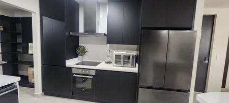 - Cocina equipada con barra, estufa, campana, refrigerador y microondas