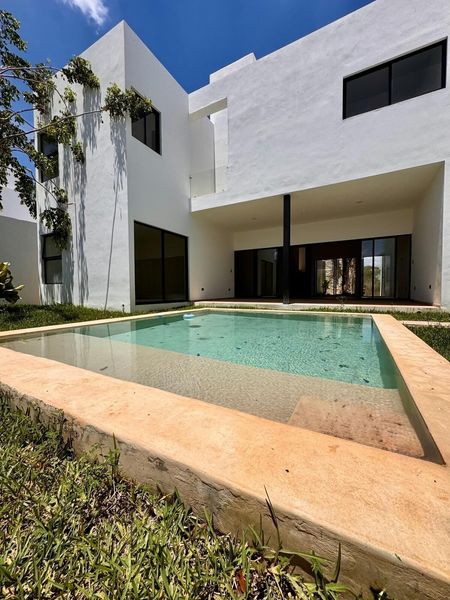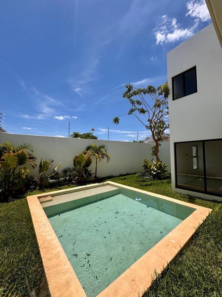 Moderna casa en venta con 1 recámara en PB y 3 en PA, cocina equipada, alberca, cochera techada y portón.