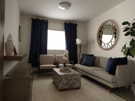 Incluye: puso interior con loseta, yeso pulido, loseta en áreas húmedas de baño, huellas para un auto, banquetas frontal y posterior, marcos de metal, puertas y muebles de baño estándar.