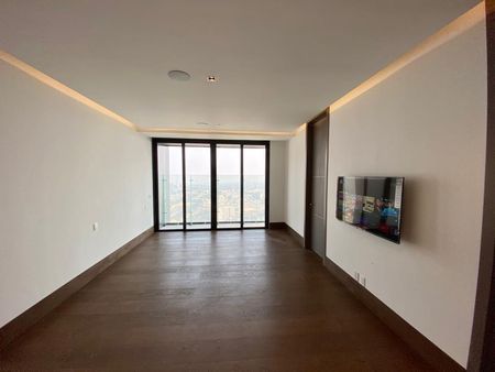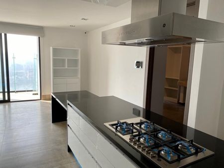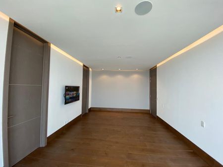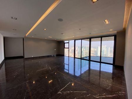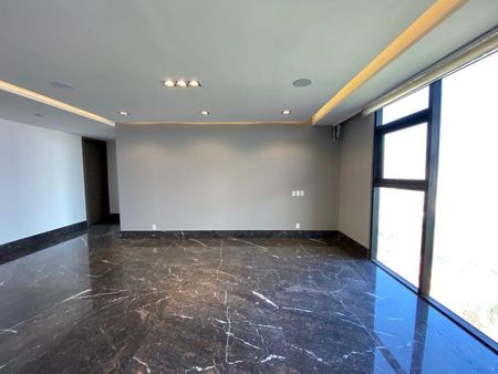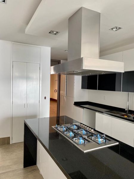 Departamento de 451 m² con acceso privado desde dos elevadores directos al interior. Cocina equipada, 3 recámaras con baño y vestidor, family room, oficina, baño de visitas, cuarto de servicio, lavandería, bodega en el mismo piso y 4 cajones de estacionamiento.
