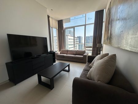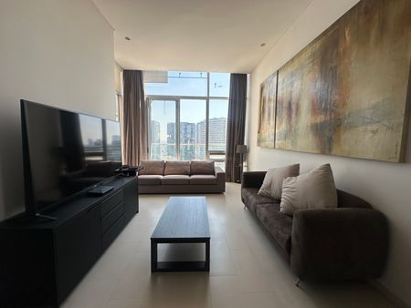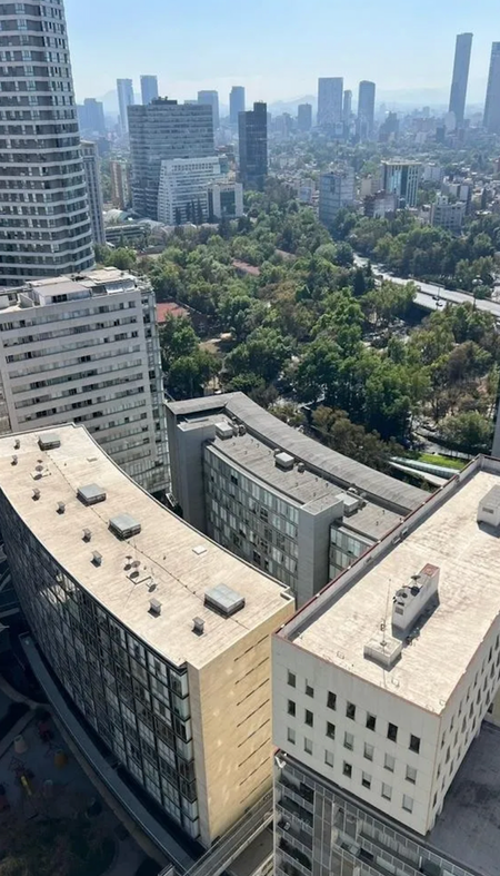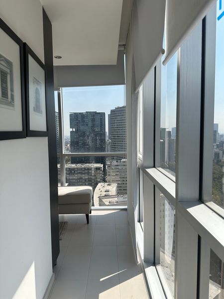 El departamento cuenta con cerradura inteligente, la estancia para comedor y sala con amplios ventanales y vista exterior, techos de doble altura. Cocina abierta totalmente modificada y mejorada, barra al centro tipo isla, estantería extra, alacena con puerta, área para centro de lavado. Dos recamaras con clóset color nude y puertas corredizas y pisos de madera, comparten un baño completo con cancel.