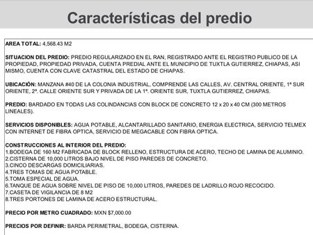 El predio cuenta con bodega de 160 mts cuadrados, con estructura de acero, techo de lámina; cisterna 10,000 litros; 5 descargas domiciliarias; tres tomas de agua potable; tanque 10,000 litros a nivel de piso; caseta de vigilancia; tres portones.