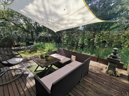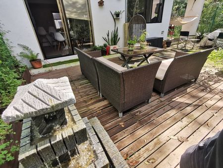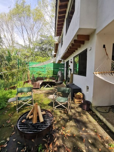 La casa tiene jardin y patio con sala exterior, hamaca y fogatero