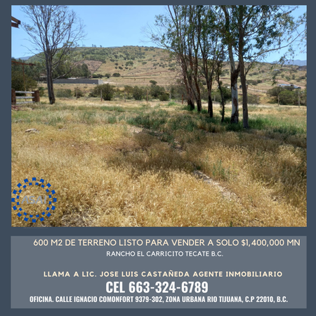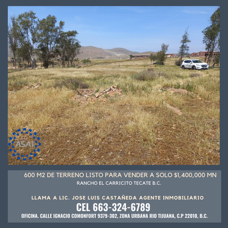 Se vende Terreno de 600 m2 en Rancho El Carricito, Tecate B.C.