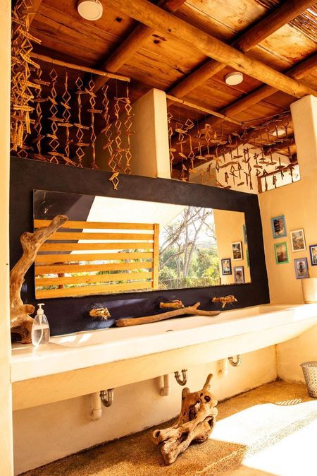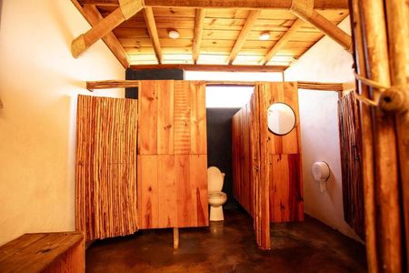 Aplanados finos de cemento y madera , pisos de concreto, techos con estructura de madera y muebles de baño de buena calidad.