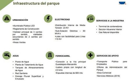 Vigilancia 24/7, alumbrado público y servicios como registro cfe de luminaria, registro telmex y megacable, infraestructura de agua con 2 pozos con capacidad para 120 lps, tanques de almacenamiento de agua presurizada, líneas de agua potable, red sanitaria, drenaje fluvial superficial/entubado, registro siapa, suministro de gas natural comprimido, Espuela de ferrocarril de 2 km de longitud.