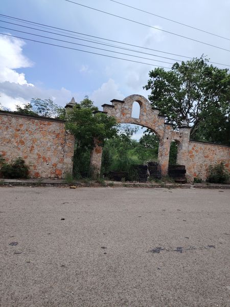 Barda de piedra al frente, con fachada de arco.
