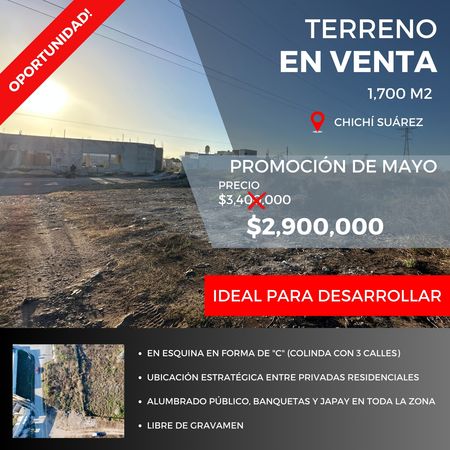 El terreno se ubica en la zona residencial de Chichí Suárez, pero pertenece al municipio de Sitpach, se encuentra en esquina. Ideal para desarrollar proyecto habitacional o comercial gracias a su estratégica ubicación muy cerca de periférico y entre privadas residenciales como Las Acacias y Residencial Floresta.