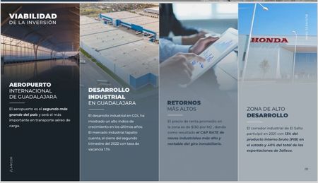 Lotes de Terreno en Parque Industrial de primer nivel con opción a construcción de la Bodega por el desarrolador en Km 17.5 Carretera GDL - Chapala, con estratégica ubicación a 6 Km del Aeropuerto y a 2km de Carretera El Salto, con los siguientes Servicios: Drop Lots, Sala de descanso para choferes, Parque Lineal, Enfermeria, Business Center, Comedor, Edificio de Admón y Mantenimiento, Estacionamiento, Ciclopuerto, Carril de aceleración y desaceleración, Servicios ocutos, Vialidades de concreto hidráulico de 14m de ancho, Energia eléctrica en media tensión, Sistema contra incendios, Salón para capacitaciones, Barda Perimetral, CCTV, Accesibiidad a transporte público, Ductos para diferentes proveedores de telefonía e internet, Alumbado en lámparas LED, Pozo de agua, Planta de tratamiento, Seguridad 24/7. Invierta en el mejor Desarrollo Industrial de la zona con un retorno anual en renta superior a otros bienes raíces. 25 años de Trayectoria de los Desarrolladores con experiencia consolidada.Preguntar al asesor por disponibilidad de lotes y precios de acuerdo al método de pago. Se estima terminación del Parque en Diciembre 2024