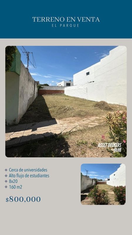 TERRENO EN VENTA FRACCIONAMIENTO EL PARQUECerca de universidades Alto flujo de estudiantes8x20 160 m2$800,000
