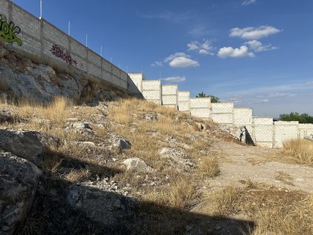 En total de bardas son 157 m2 de bardas de 3 metros de altura, reforzadas y con 5 pilares centrales con mampostero para resistir 4 pisos más.