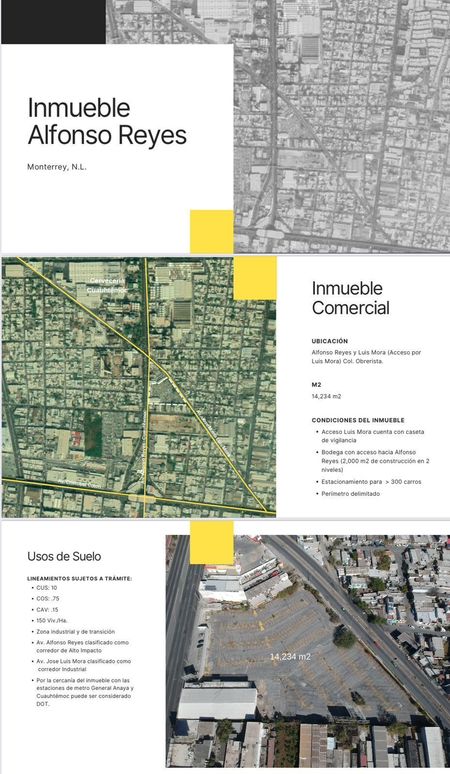 Terreno de 14,234 m2, acceso a Luis Mora. Cuenta con caseta de vigilancia. Bodega con acceso hacia Alfonso Reyes, 2,000 m2 en dos niveles. Estacionamiento para 300 carros. Perimetro delimitado.