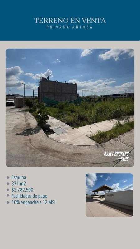 TERRENO EN VENTA PRIVADA ANTHEAEsquina371 m2$2,782,500Facilidades de pago10% enganche a 12 MSI