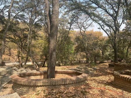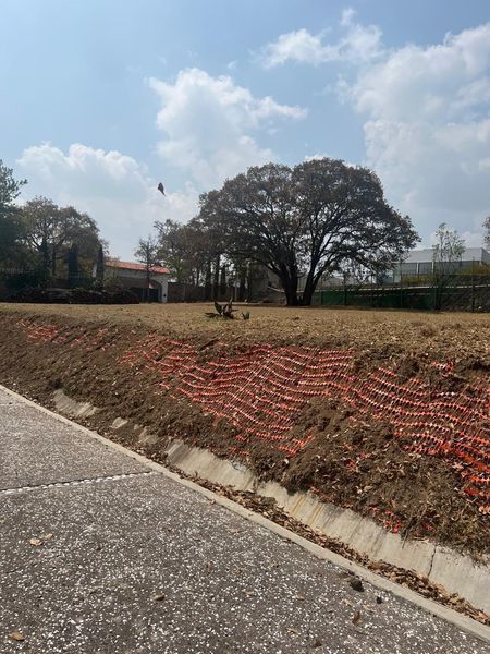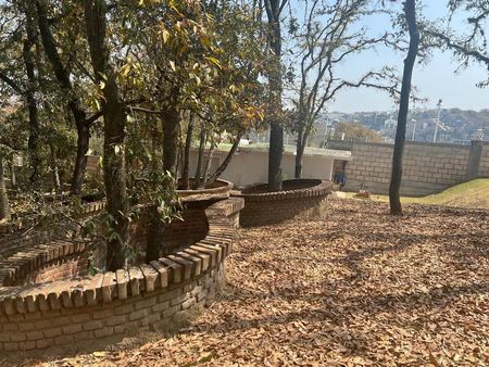 Árboles protegidos con arriates de tabique aparente, barda perimetral excepto la colindancia sur-oriente.