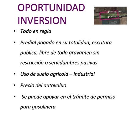 En resumen, este terreno puede rentarse, venderse o desarrollarse bajo un modelo “llave en mano”, adaptando el proyecto a los requerimientos del cliente: desde una gasolinera independiente hasta un complejo mixto comercial-industrial de alto rendimiento