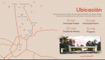 Ubicado a 25 minutos de la ciudad de Mérida, principales playas a 8 minutos de chicxulub pueblo, a 10 minutos de chicxchulub puerto y a 15 minutos de Progreso.